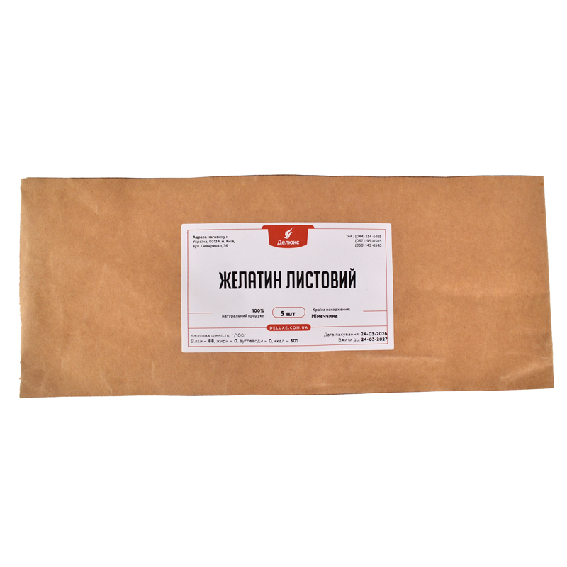 Мы работаем с прямыми поставщиками и гарантируем качество листового желатина. Пластины упаковны герметично в больших коробках, после чего при соблюдении всех норм, мы его пакуем в специальные трехслойные пакеты по 10 и 50 листов. Поэтому желатин практически не контактирует с воздухом.