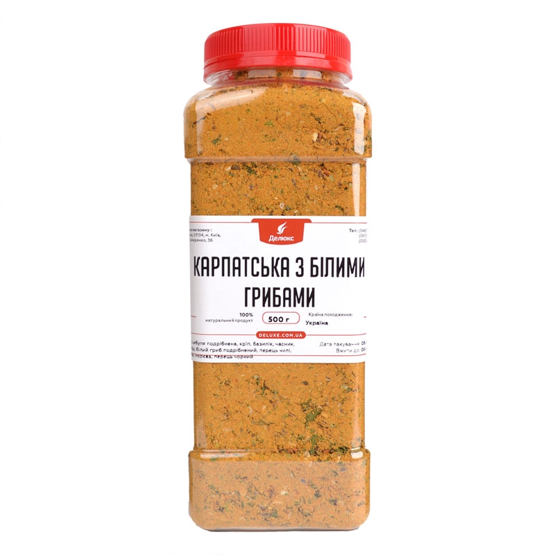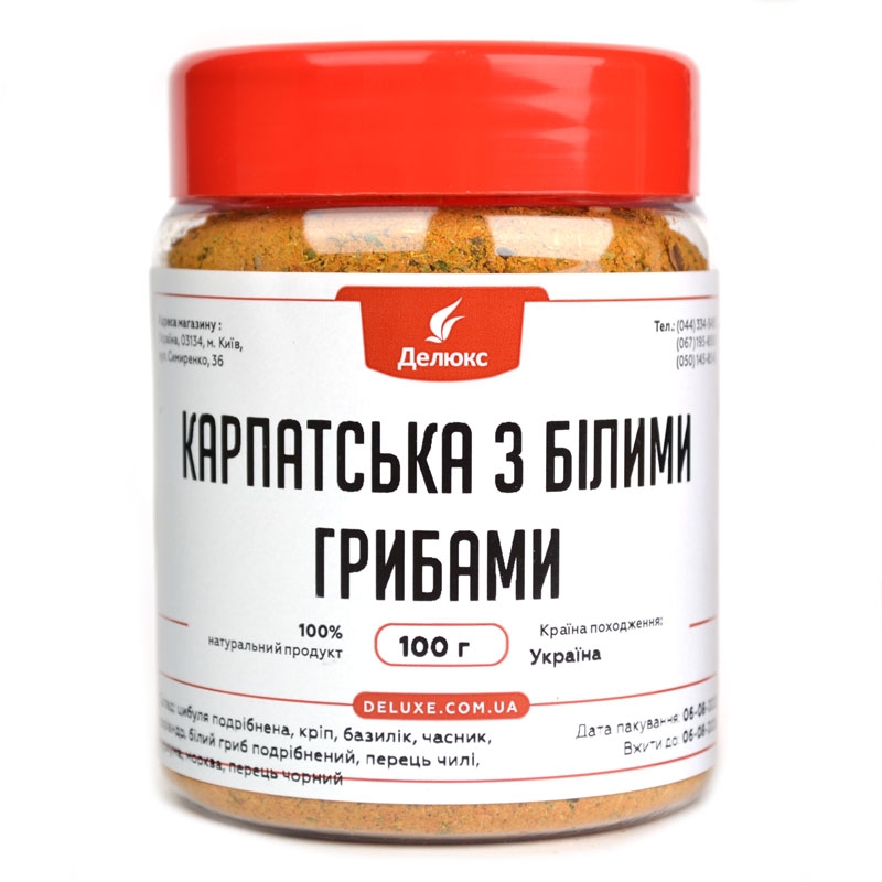 Традиційна приправа Карпат із додаванням сушених білих грибів – одна з улюблених сумішей спецій. Особливо популярна в українській кухні. Ця суха заправка зроблена з трав і спецій, чудово доповнює багато страв, надає особливого грибного аромату.