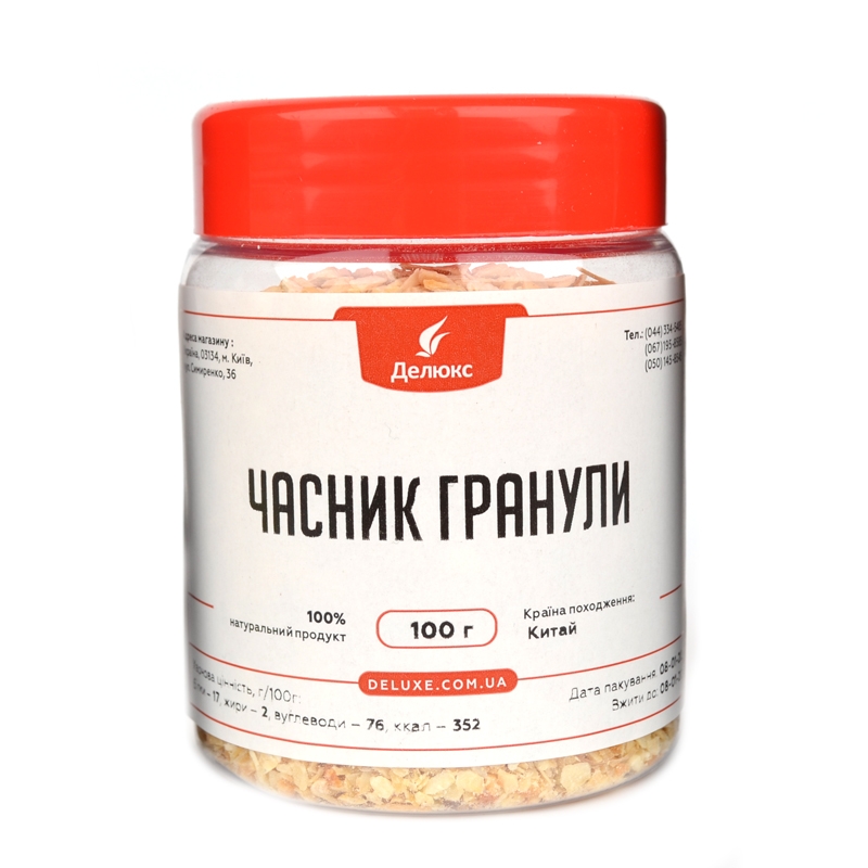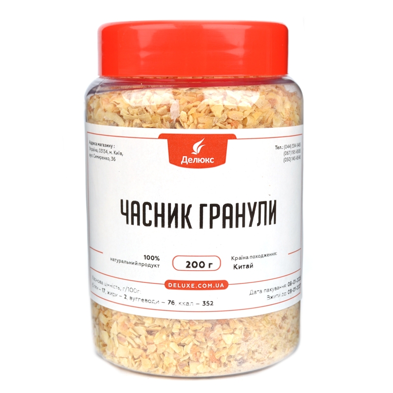 Придбати часник у гранулах за вигідною ціною можна в інтернет-магазині Делюкс у Києві. Калібр гранул 8 на 16 мм (приблизно, як гречка), колір світло-бежевий. Залишкова вологість 6-8%. Передбачено різні варіанти пакування. Продаж організований оптом, в роздріб.